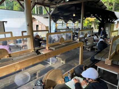 野外炊事場で2日目の振り返りをしました。
