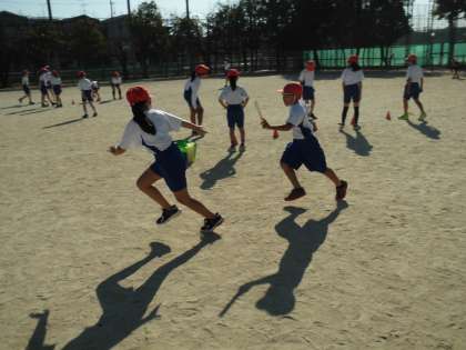 タイムを縮めるために,グループでバトンパスの練習をしました。