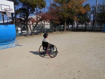 車いすで運動場を移動する学習をしました。
