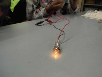 手回し発電機で豆電球に電力を送り、