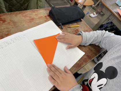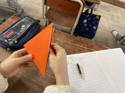 色紙を折ったり、切ったりしながら、二等辺三角形や正三角形を作りました。