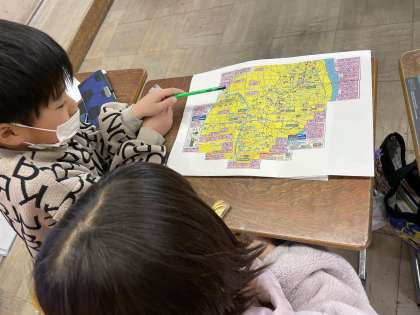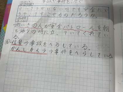 社会の学習では、地域では事故や事件をふせぐためにどのようなくふうがされているのかを調べています。