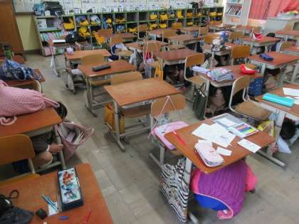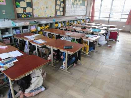 教室にで過ごしていた子どもたちは、速やかに机の下に1次避難をしていました。