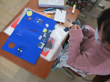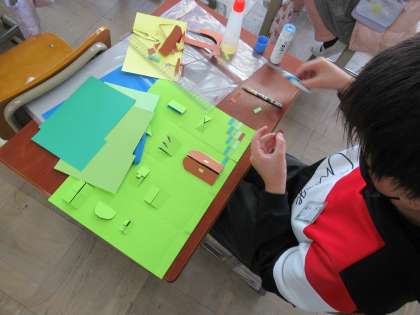 窓の形を考えて切り開いたり、窓を飾ったり、そこから見えるものや人を作ったりして