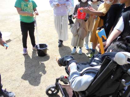 3月16日(木)に、呉竹総合支援学校3年生と3年4組と一緒に交流しました。保護者の方が用意してくださったいろいろな用具を使ってシャボン玉をとばす活動をしました。友達と一緒に用具を持って、回したり走ったりして工夫していました。みんなで楽しむ遊び方が見つかりましたね。また、来年度も交流したいですね。