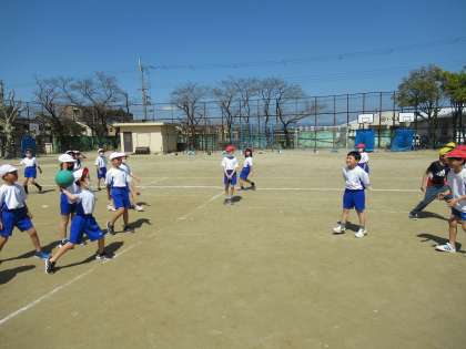 2年生での学習もあと2日。今日は、3クラス集まって、1年間一緒に学習してきたなかまと楽しくドッジボールをしました。