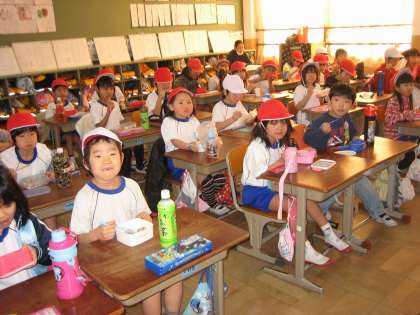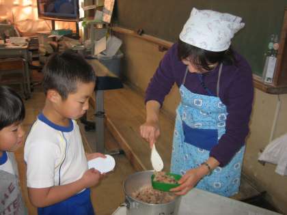 地域の方々にお世話になり,3年生と5年生が田植・稲刈りをさせていただいたもち米を使って 新春赤飯賞味会を行いました。