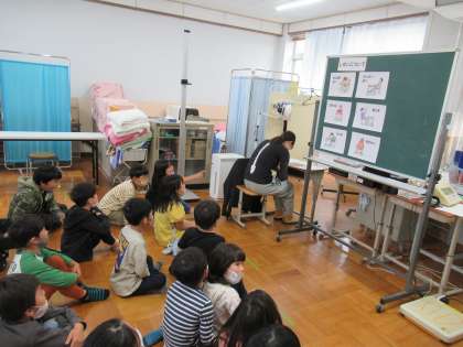 検査の前に、養護の先生から正しい姿勢についてのお話がありました。