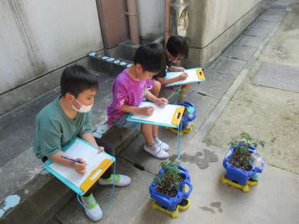 先週の金曜日に植えたミニトマトの苗を観察し、カードに記録しました。