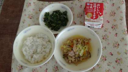 今日の献立は、ごはん・牛乳・豚肉とキャベツのみそいため・ほうれん草とじゃこのいためもの です。