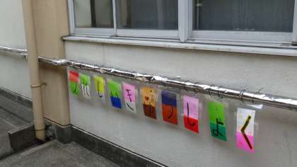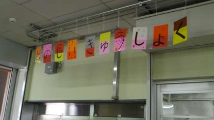 給食委員会で給食が楽しくなる掲示物を作ったので、給食室に飾りました。通路もとても明るくなりました。