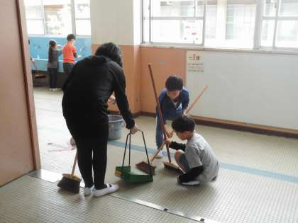 1年生と一緒に掃除をしています。ていねいにほうきの使い方やぞうきんのしぼりかたについて教えていました。