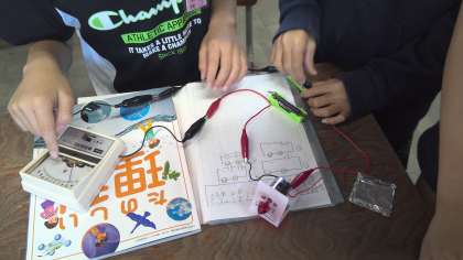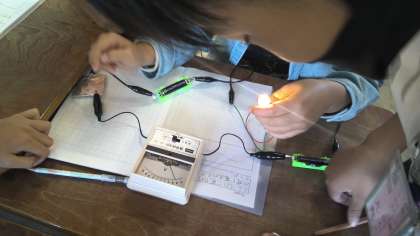 理科の電池のはたらきの学習では,電流には向きがあることや,電池の数やならべかたによって電流の大きさが違うことを実験を通して学習しています。