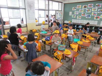 訓練の放送を聞いた子どもたちは、速やかに下校の用意をして、引き渡しの準備をしています。