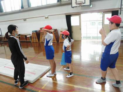 体育科の学習ではマット運動が始まりました。5年生としてたくさんの技を組み合わせながら活動しています。どうすればより綺麗に技ができるか、友だちと相談しながら活動していました。