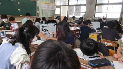 ホワイトボードを使って、相手に伝わる分かりやすい説明を目指して、みんなで学習に取り組んでいます。
