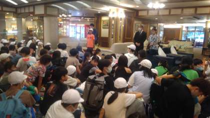 本日、宿泊する海月館に到着しました。入館式では、代表児童があいさつをしました。