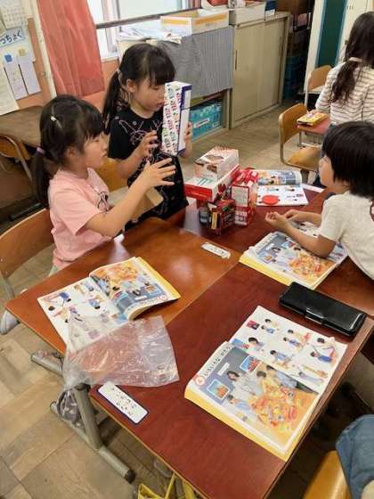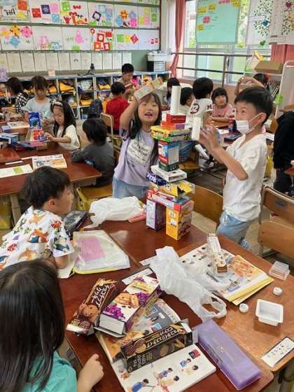 空き箱を使って積んだり並べたりして生き物や乗り物などを作っていきました。「たくさん積めたよ!」と楽しいそうにタワーやキリン、ワニなどを作っていました。