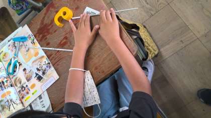 今回の図工は「つなぐんぐん」です。新聞紙を使って、まずは細く巻いていきます。細く巻いた材料を使って、思いつく形を作っていきます。細く細く巻くと新聞紙とは思えないくらい固い棒になります。工夫しながらどんな形を作っていくのでしょう。