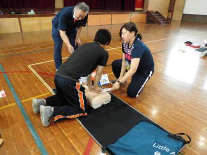 子どもたちの大切な子どもたちの命を守るため、心肺蘇生法などを教職員全員が実技研修しました。また、AEDの使用法についても講習を受けました。