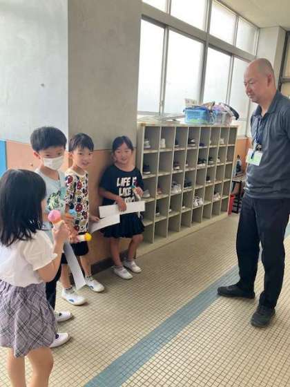 「羽束師小学校の先生達のことが全然分からない!」ということで先生達にインタビューをすることにしました。手作りのマイクを持って名前や好きな動物、好きな食べ物などたくさん質問をすることができました。