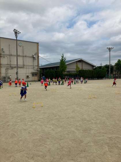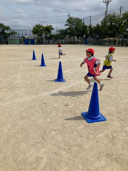 くねくねリレー、ぐるぐるリレー、ぴょんぴょんリレー、3つのリレーをして楽しみました。コーンの回り方に気をつけて走っていました。