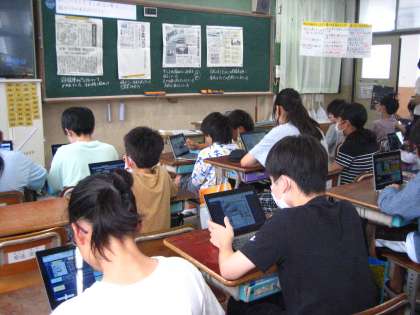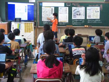 社会科の学習で、単元の学習に関連したデジタルの新聞記事を活用し
