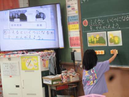 数図ブロックを操作しながら、机の上で考え、前に出て発表しています。