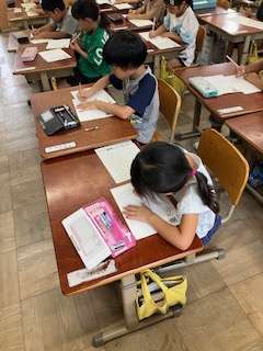 硬筆展に向けて「つくし?にじ?いけ?うた」の言葉を手本を見ながら丁寧に書きました。いつもよりもさらに集中していてみんなとても良い字が書けていました。