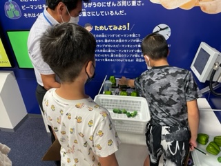 何度やっても同じ重さを計ることができる組合せ計量機を試す子どもたち。