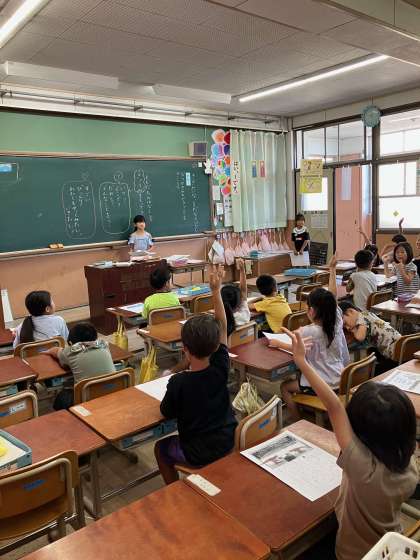 夏休みの出来事をみんなの前で話しました。最後には、たくさんのお友だちが質問や感想を手を挙げて伝えてくれました。話を聞いた後に、自分の思いや考えを相手に伝えることは本当に大切ですね。