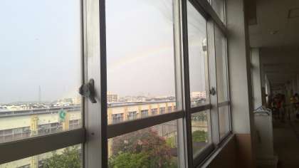 授業中にザーッと雨が降りました。雷も少し鳴って、外の様子を気にする姿が見られましたが、下校するタイミングには雨も小雨になって…。大きな虹が空にかかっていました。少し前には外側にもう一つ虹がかかっていてダブルレインボーだったと教えてくれる子もいました。小降りになってよかったね!