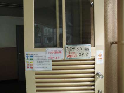 学校では暑さ指数計を運動場と体育館に設置しています。体育をする前に確認して運動の強度や時間を調整しています。また休み時間の前には、子どもたちにわかるように掲示して自分たちでチェックして遊ぶようにしています。
