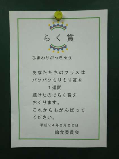 2/9(木)〜2/15(木)の期間中に、ごはん・おかずを完食できると賞状が貰えます。