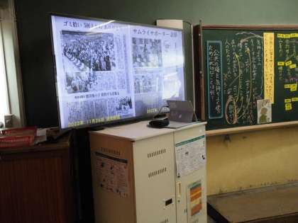 また、授業後半に昨年度のサッカーワールドカップで日本サポーターがごみ拾いをしていたことが、他の国のサポーターに広がりを見せた新聞と動画をテレビで見せ、公共の場を気持ちよく使えるようにするためには、何が大切かを深く考えました。