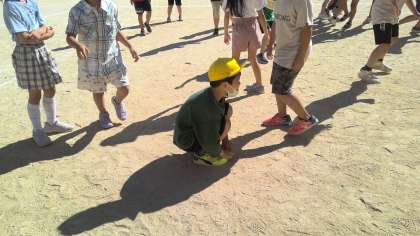 太陽との関係に気づくために、かげふみ遊びをしています。