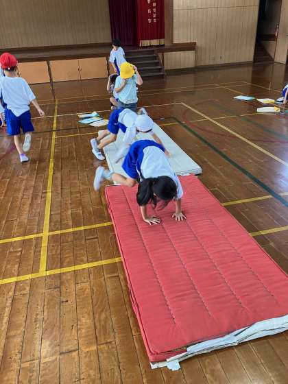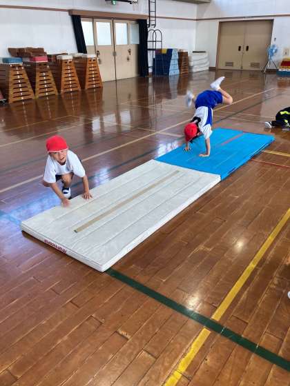 体育ではマット遊びが始まっています。いろいろな回りかたをして楽しく遊んでいます。