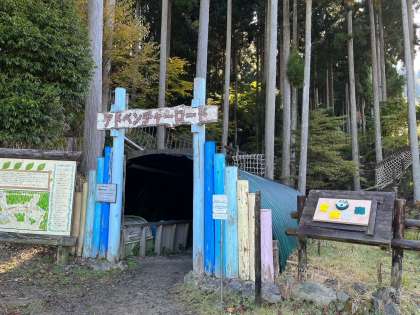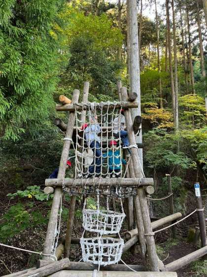 冒険の森アドベンチャーロードです。子どもたちはアスレチックを楽しんでいます。難しいコースにも果敢にチャレンジしてます。苦手な子には励まし、助け合いながら活動しています。
