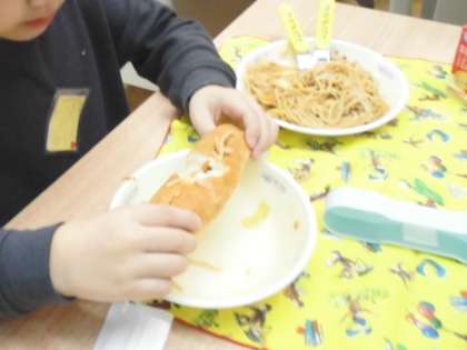 給食の時間になると、パンにはさんで