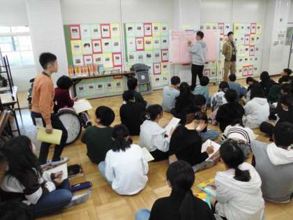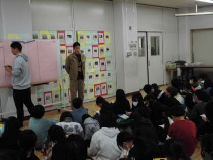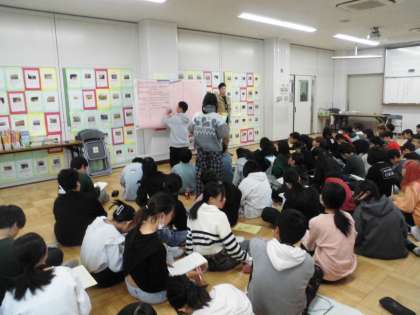 総合的な学習の時間ではゲストティーチャーをお招きし、米作りについてのインタビューをしました。実際にお米を作る中での工夫や思い、苦労などをたくさん聞くことができました。