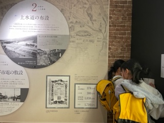 インクラインの模型や、京都の町がどのように変わったかなどの資料をまじまじと見る子どもたちです。