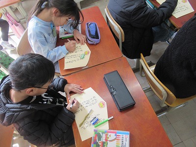 3時間目には、今年の目標を絵馬の形に切った画用紙に書きました。