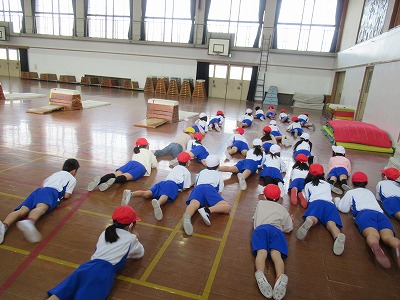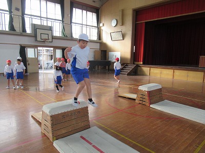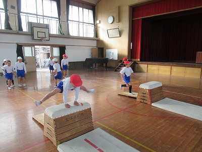 準備運動の後、開脚跳びや横跳びこし、台上前転などの技を練習しました。