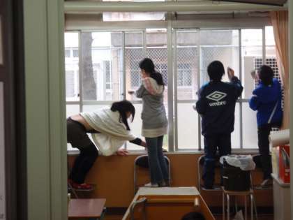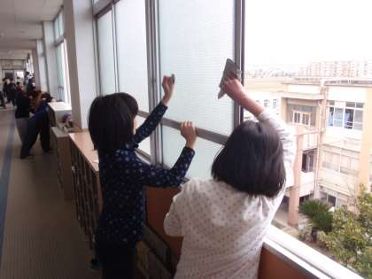 3月14日・15日の二日間に各部屋の窓ふきを6年生全員で行いました。