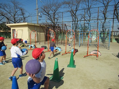 「遠くまで投げよう」「ねらって投げよう」の2つのめあてでボールを投げる