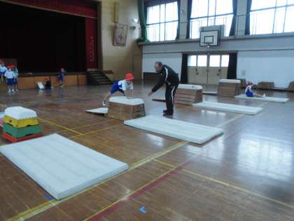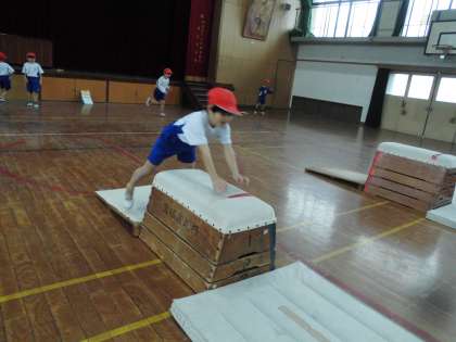 3だん、4だん、5だんの横、縦のとび箱を跳んでいます。自分で、目標を決めて、1人1人がチャレンジしています♪