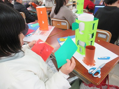 前回窓を開けたたてものを建て、窓の中や建物のまわりを飾ります。