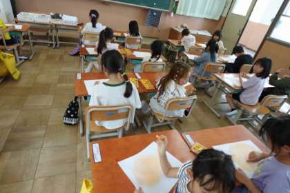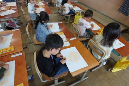 1年生の学年目標が決まりました。1年生の学年目標は『みんなでパワー!〜やる気・元気・笑顔〜』です。元気いっぱいの1年生としてがんばろうと、みんなで話し合いました。その後、パワーを出している自分の顔をかきました。クレヨンを上手に使って、自分の顔をかくことができました。