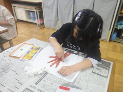 手の形を木の幹や枝に見立ててクレパスで描き、