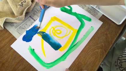 図工で絵の具+水+ふで=いいかんじ!という学習をしました。グラデーションや筆の動きを楽しんでいました。とっても楽しそうに画用紙に向かう姿が見られました。